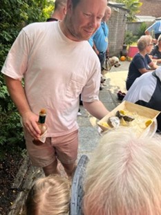 As we eventually reached our destination in Whitstable and stepped foot inside Joe and Britt’s house, we were welcomed with a refreshing surprise in the form of chilled towels to soothe our brows, accompanied by a generous glass of sparkling champagne, to invigorate our tired bodies, which was an unbelievably hospitable welcome and start of what was to follow. Fran offered a rejuvenating ‘stretch class’ catering to riders with weary limbs, which 7 or 8 riders and Martin’s grandson enthusiastically took part.