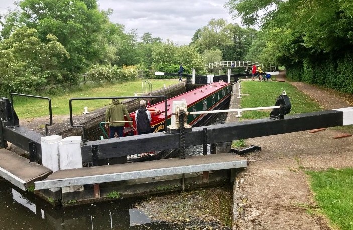 And there is not a lot of room to spare. The “captain,” who is controlling the boat, is at the back end. He has to judge how far the front end is from the lock gates, and the canal boats do not have brakes to stop them!