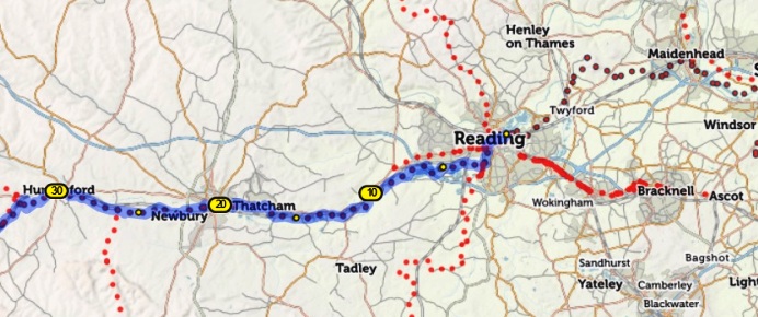 This is part of the (zoomable) map which shows our first afternoon’s ride, the 30 miles from Reading to Hungerford, where we stayed overnight.