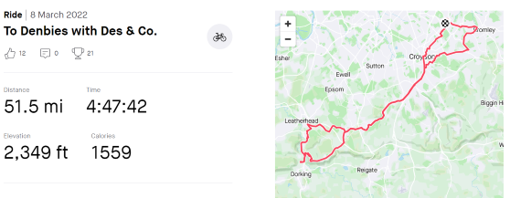 Missing from our group photos, was our camera man, Asif, who also provided the Strava stats and route outline. But note, the top loop was just for Asif and Julie. Fiona and myself, starting and finishing at Purley did about 15 miles less, and I might add, at least 200 ft less of climbing!