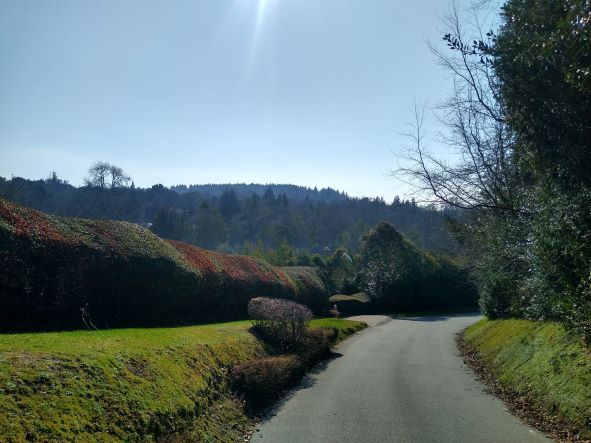 Then it was the Tuesday Ride – cold again – according to the BBC Weather it felt like 2c when we started from Shurgard at 10.00. But there was some bright sunshine! So to make the most of this golden orb we did a bit of exploring on our route to Denbies. A detour, skirting Leatherhead and Mickleham Downs, we took a little diversion thru a private estate of big houses (Givens Grove?) with great views over the surrounding Downs and wooded hills.