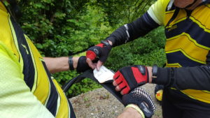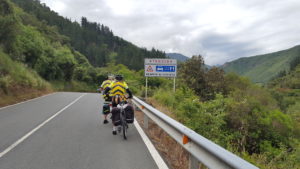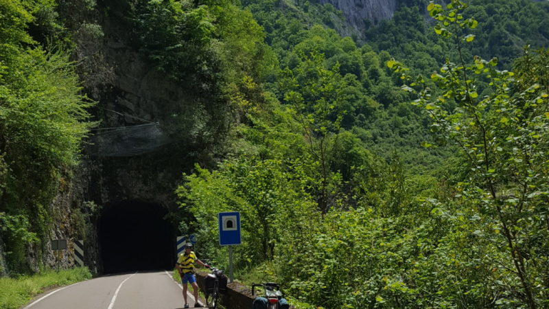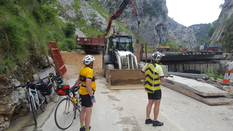 One replacement tube and a crisp packet saw us back on route but it was not to be an easy day. Just as we arrived in Panes for lunch, the same tyre had a catastrophic failure as the wire bead came apart. A lady in the cafe told us that our planned route through the River Deva gorge was closed but the alternative involved a mountain and extra 30km – so we decided to head on for a nose around. After all, we cyclists can get through almost anything – right? We waved Des and his bike goodbye in a 50 Euro taxi to the bike shop in Llanes and moseyed on down the road.