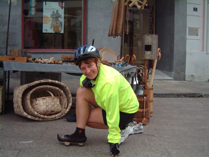 Unfortunately it was siesta time when we arrived and virtually everything was closed until 4 o’clock. There was however, a market stall in the main square, selling local traditional items. Ewa and Irena  took a liking to the strange, hand carved wooden clogs, but they were a bit too big for pedalling in toe clips!