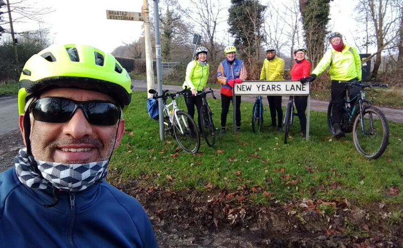 Jim K had posted his GPS route on the Ride Register. This was the longest, and in my opinion the most interesting route, following some very minor and little used country lanes. In particular New Year Lane which leads from Knockholt to Pratts Bottom. Below, some Anerley members celebrating a cold, new year, Jan 2020.