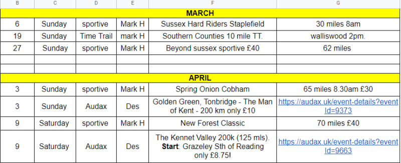 Those of you who use the Rides Register may have noticed an extra tab at the end for Events. These include Sportivs, Audaxes, Time Trials and even some tours that are of interest to all in the club.