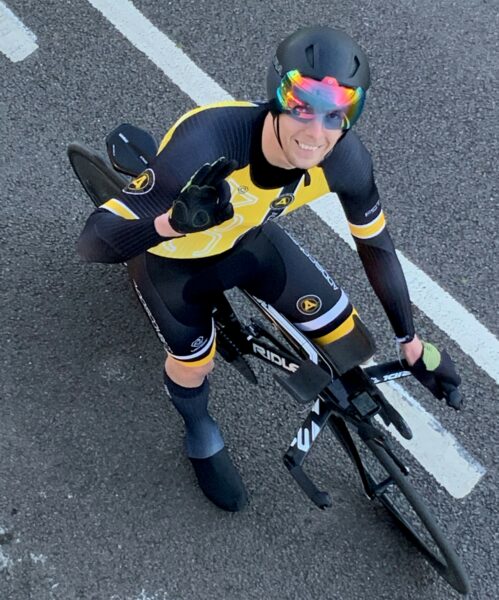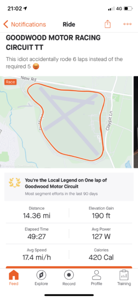 The organiser – clearly a massive Star Wars fan – had signed off the entry confirmation email with “May the Force be with You,” well he wasn’t joking this time! A 35mph headwind hit me on the start line and pinned me back along the first half of the course, which had a slight incline or “false flat” according to my son. As I made the right turn along the bottom straight the crosswind pushed the bike so much I was clinging on to the edge of the track. The reward was the next straight with the wind behind and I flew back round into to more crosswind to complete lap 1. It was a 5 lap course but I got carried away and managed to mess up and before I realised it, I had started my 6th lap. Very annoying and stupid of me but hey ho, it was a nice evening and I was never going to get a better time because of the wind.