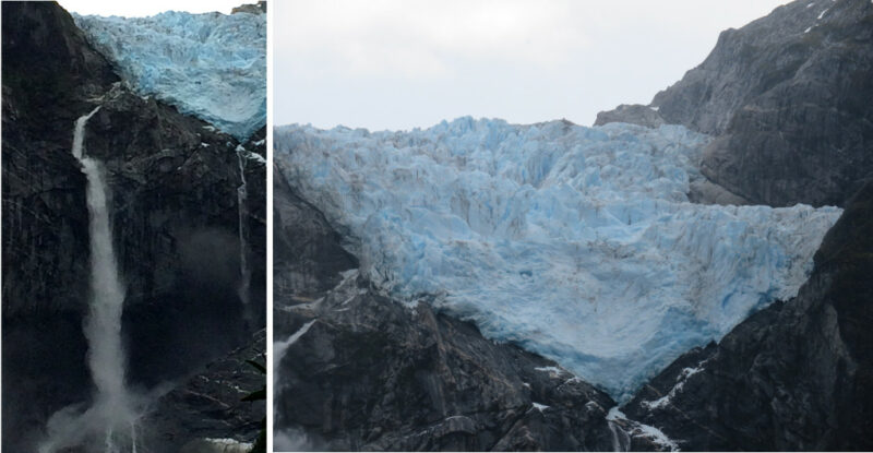 We were at the entrance of the Queulat Puyuguapi NP as it opened and were soon making our way up through a dense rainforest known as the Enchanted Forest Trail, climbing steeply through the overhanging trees and plants. The walk was only around 3km each way but involved scrambling up slippery rocks. We could hear the glacier long before we could see it as pieces of ice came away and fell to the ground. Suddenly we burst out into the open and in front of us was the most amazing sight – a glacier literally ‘hanging’ down the rocks.