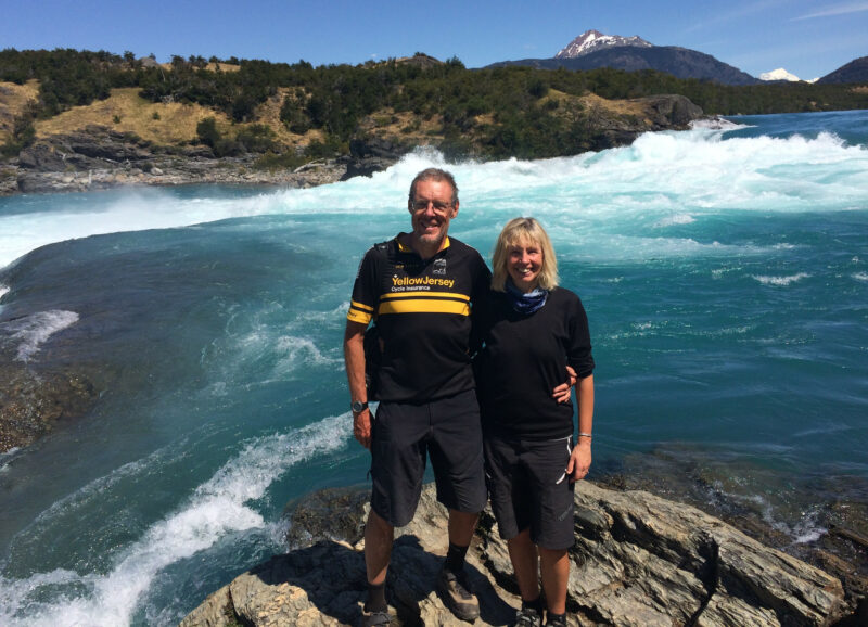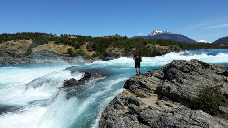 Following the wide, deep blue River Baker, we soon came to an area where it converged with the glacier River Neff. As both rivers are large and fast flowing the convergence is dramatic so we locked our bikes and walked the mile to see this popular sight. Tim wanted to walk further and climb some rocks hanging over the gushing water, so I found somewhere to sit in the sun and told him to pick me up on his way back. I could see him on the rocks in the distance and after a while began chatting to a French family who were interested in our trip. When I looked up I noticed Tim was not in sight but assumed he’d be back soon – time passed and I began to wonder where he was. I walked the track towards the rocks but there was no sign. I went back to where I had been waiting – no sign.