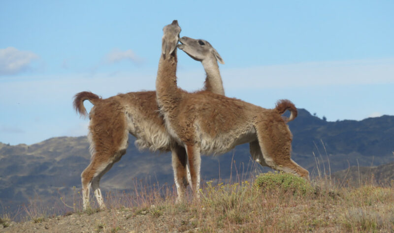 Although already exhausted we were really excited to see these animals along the roadside – two males began to fight, spitting and hissing at each other before nipping and biting, using their strong necks as weapons. It was quite a sight to see. There were herds of Guanacos many with their young and they weren’t worried by us at all, sometimes slowly crossing in front of our bikes. Eventually we reached a hotel where we expected to find our campsite. Unfortunately it was still another couple of miles over tracks and wooden bridges but well worth the effort.