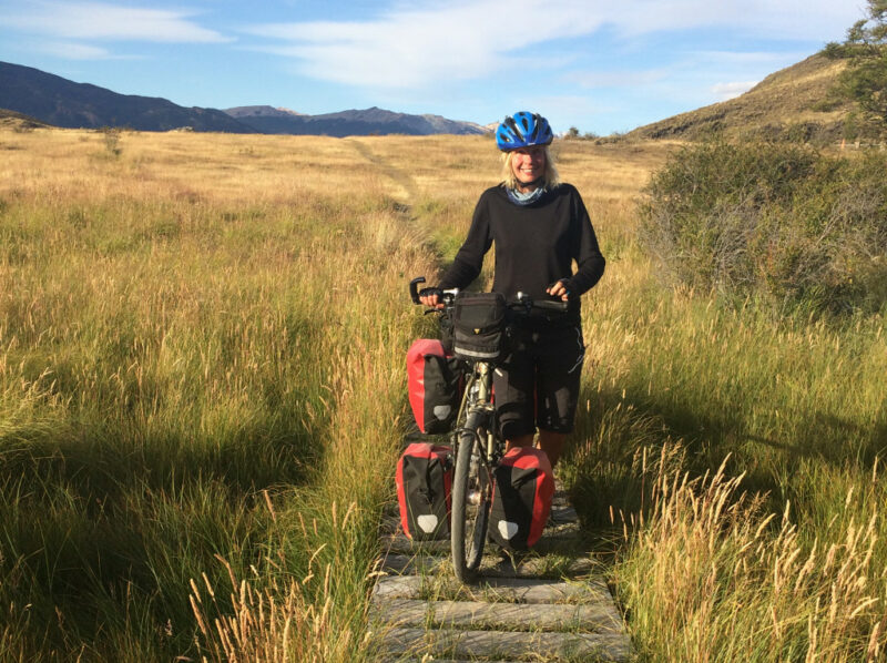 The road surface deteriorated over the next few days and became very tiring, difficult gravel again. We had one particularly slow, hilly and exhausting day – struggling to keep the heavy bikes upright on some very difficult sections. During our lunch break that day, on a bridge eating our biscuits and tuna, a cyclist coming the other way stopped to chat (a bit embarrassing as I was under the bridge having a pee (not near the river!) I was aware he had to have known what I was doing as I climbed back up to the bridge). He told us about a new National Park that was worth a visit. Although the road was tricky – large stones and gravel – he guaranteed I would see my first Guanaco (Lama like mammals). So, although it was getting late in the day we took the excursion and turned off our difficult gravel road onto an even more difficult gravel road!
