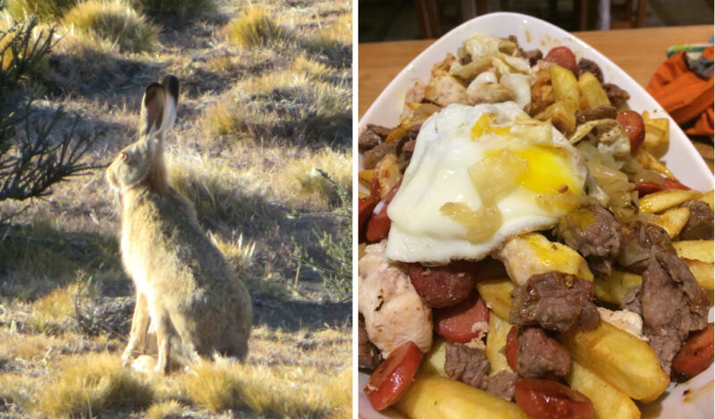 After a fabulous night’s sleep in absolute darkness and quietness we made our way back through the National Park very early in the hope of seeing more animals. We were lucky to see a Chilean Skunk by the side of the road before it disappeared into the bushes and a hare that laid down, pinned its ears down its back camouflaging itself in the undergrowth. We were next headed towards a town called Cochrane where we were lucky enough to find a pub that not only sold good beer for Tim but also a national dish of different meats and chips piled high with fried eggs on top – looks gross but omg just what we needed!