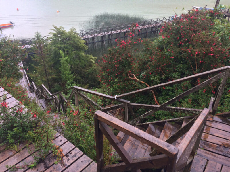It took a couple of days to get to Caleta Tortel (fishing village on stilts). This was another excursion that Tim had planned before leaving. The entire town is built on stilts with boardwalks and long flights of steep wooden stairs connecting them. By the time we arrived in the town it was, once again, raining hard. I was really fed up, very wet and extremely cold. We stood where the road ended and surveyed the steep, slippery wooden steps that seemed to go down forever. How would we get our bikes down them, it seemed impossible. We were so tired that decisions took forever and we wasted a lot of time looking for a Cabana or some other place to stay but everywhere was full.