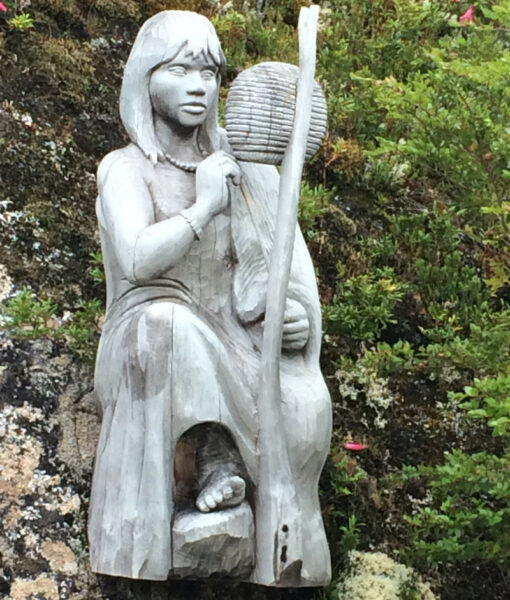 Once the tent was up we set off to explore and try to find an open café where we could warm up. We carefully walked down the remaining steps to a long boardwalk (over 1 and ½ miles) which followed the sea around and had some amazing wooden carvings along the way.