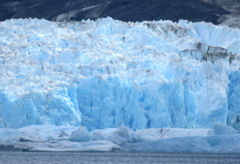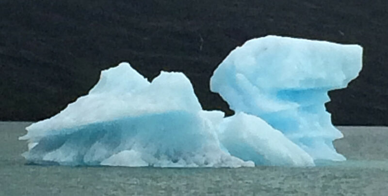 The boat trip to the Glacier was an adventure in itself. The boat was smaller than I’d expected and we were all asked to wear life jackets. The boat went really fast and we bumped along, hanging onto our seats that ran along the inside of boat facing each other. The sea was getting rougher and soon our bottoms would leave our seats as it crashed over yet another wave. Suddenly one of the engines stopped. The driver put the boat into neutral and went to have a look – apparently it was leaking oil! He did something with spanners and a hammer and we were off again only to stop again a few minutes later. I was sure that had we been in the UK the driver would have realised it was late in the day, the engine was poorly and we would probably have turned around but not in Chile. We kept going and eventually began to weave in and out of increasingly big icebergs.