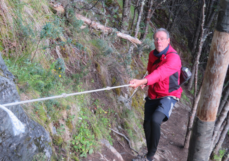 As we climbed higher and higher on slippery rocks I began my usual rantings. My bag kept falling forwards and I had trouble using the climbing rope put out to help us because of holding my wet bag. “This is ridiculous! Why couldn’t we have done this tomorrow? Why do I follow you when you are so stupid?” you get the picture! Luckily Tim was so far ahead he couldn’t hear me. Eventually we could hear the tapping of the flagpole and I concede it was a spectacular view from the top.