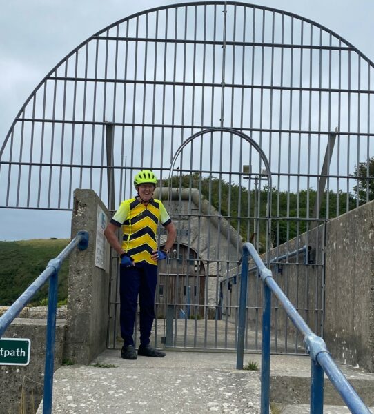 From Weymouth town centre we followed NCR 26 along the road built over Chesil Beach, that leads to the the massive lump of limestone, which is the Isle of Portland. It’s limestone was not only used to form the Olympic Rings but has been exported world wide. For example, being used to build the United Nations H.Q in New York. It was also used to rebuild St Pauls Cathedral and other famous building after the Great Fire of London in 1666. What I did not know, was that Sir Christopher Wren, the architect of St Pauls, was also the Member of Parliament for Weymouth!