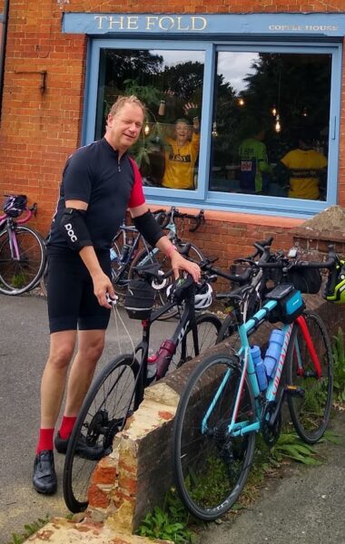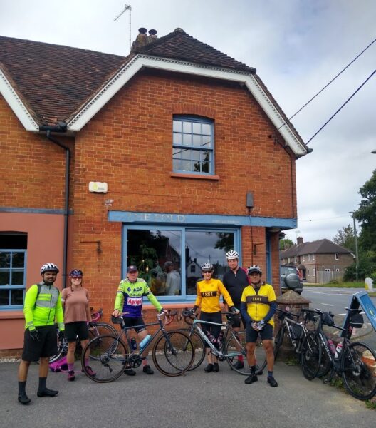 Tom went for a brutal start to test our commitment – up Portnalls Road. The reward was a fast run down Reigate Hill and at the bottom we were joined by Alison. We then cruised through Reigate Heath, Leigh, Charlwood, Faygate, Colgate, Watergate (not really, just checking someone’s reading this) and, just as I was thinking “are we going to stop for coffee before the coast”, we alighted at Cowfold on the lovely café “The Fold”. Great choice Tom. Good tasting coffee and nice ambience. The only photo we have of the place is one Asif took of me locking up my bike. I look dreadful but it needs to go in the Gazette simply for Alison’s expression in the window behind me – that was before any caffeine!