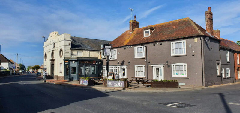 Travelling Eastwards towards Selsey and Littlehampton, the beaches are all stony but the views across the moors around Brackelsham bay and the Skylarks rising to release their birdsong will stay with me for a long time. I went past the Crown at Selsey which the club history notes as the setting for a famous picture of the club notables in 1909. Stuart Grove led an expedition in 2019 which I think proved that it was the nearby Fisherman’s Joy see https://archive.anerleybc.org/70s-ride-to-selsey-26th-august-2019/