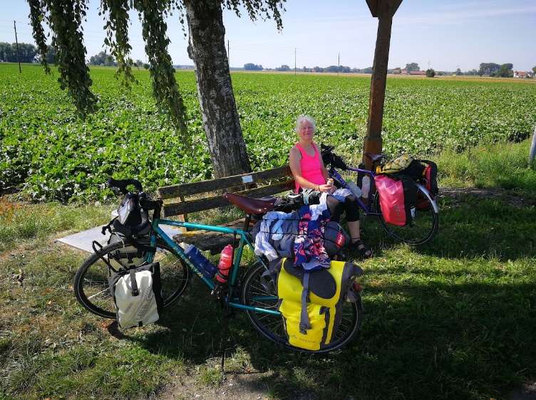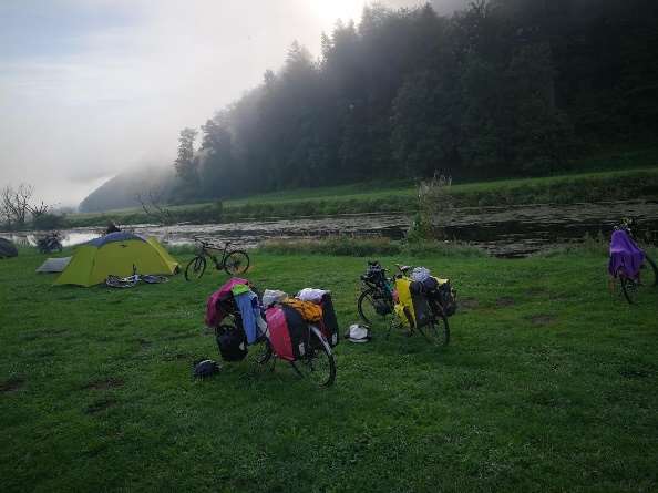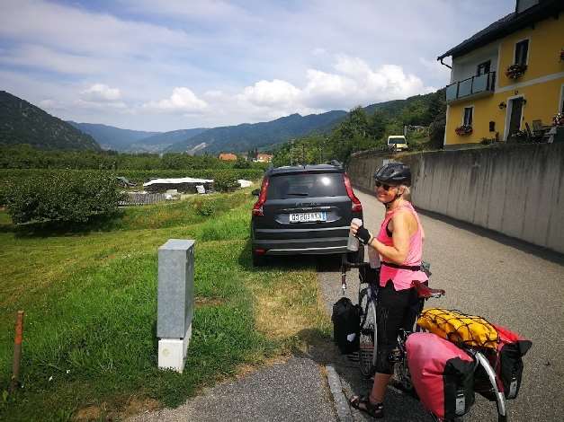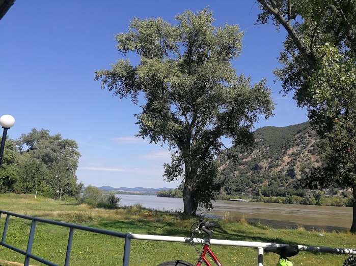 We carried on after Krems and then, due to unfavourable campsite reviews for the nearer campsite we decided to carry on further to a campsite at Zwentendorf thus covering 106km in the day, and the last 18km against the wind on an exposed section of the river dyke so we were quite tired by the time we got there. While we were clearing up after our dinner there was thunder and lightning in the distance – both our weather apps agreed that we would be getting no rain where we were so, sure enough at about 9pm the storm hit with very strong winds and torrential rain – I would say the tent held up pretty well; Sue complained that some of the river of water that seemed to flow under the tent was coming up through the groundsheet; in the morning I found that one gust of wind had actually blown the outer of the tent off the external pole system at the base, and afterwards I took to taking a bit more care in pitching the tent.