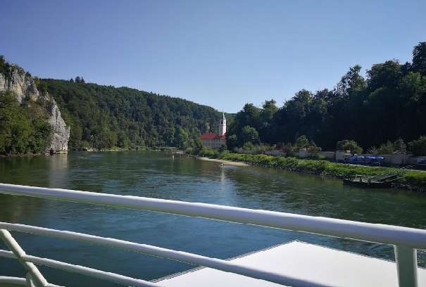 The guidebook recommended the boat option for 5km through a gorge; there is no track alongside the river so the alternative was a hilly ride to Kelheim. We cycled on to a campsite at Bad Abbach – my Garmin was indicating the temperature at 34C – hot.