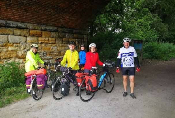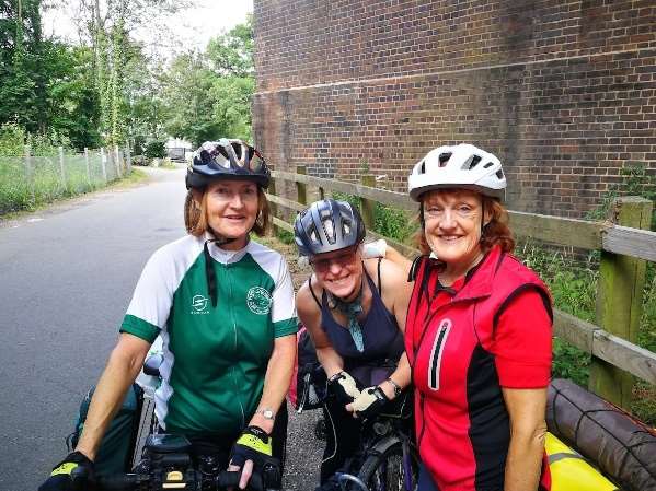 no expectation of anyone wanting to join us I put out to friends that we were doing a two night cycle camping trip from home and much to our delight a few friends indicated that they wanted to join us. We had forgotten just how heavy the bikes feel full loaded and we set off early to meet Fiona and Gerri at Woldingham school.