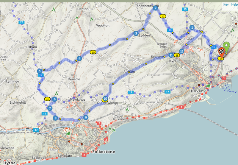 The map shows one reason why this area around Dover is so good for cycling. The red dots along the coast show the NCR bike routes 1 heading east and north, 1,264 miles to the Highlands/Islands of Scotland. And heading west, NCR 2 is the coastal route, 378 miles to St Austall in Cornwall.