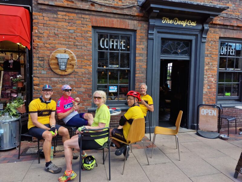 From the other side it is a long downhill into the Centre of Rochester, past the magnificent castle ruins surrounded by a park. Peter recommended the High Street as a place with many cafes to choose from and we selected Deaf Cat Coffee which allowed us to sit outside the “Second best coffe house” in Rochester. As we dismounted Paul failed to decleat but saved himself by landing on Julie – leaving her still cheerful but chain tatooed and bloodied.