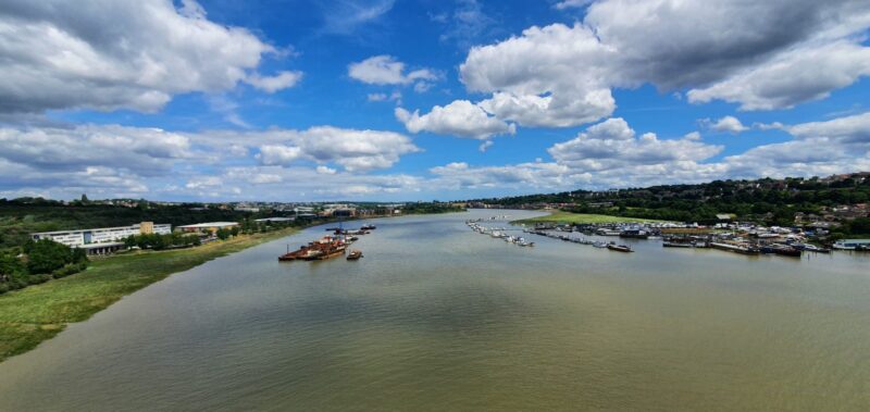 When I told Peter that my route took us through Strood, he made a raspberry and described it rudely so when as we cycled towards the M2 bridge, we diverted over it along the separated cycle path. We were very high up above the river, glorious views but a bit dizzying with the cross winds and the strobe effect of the fencing.