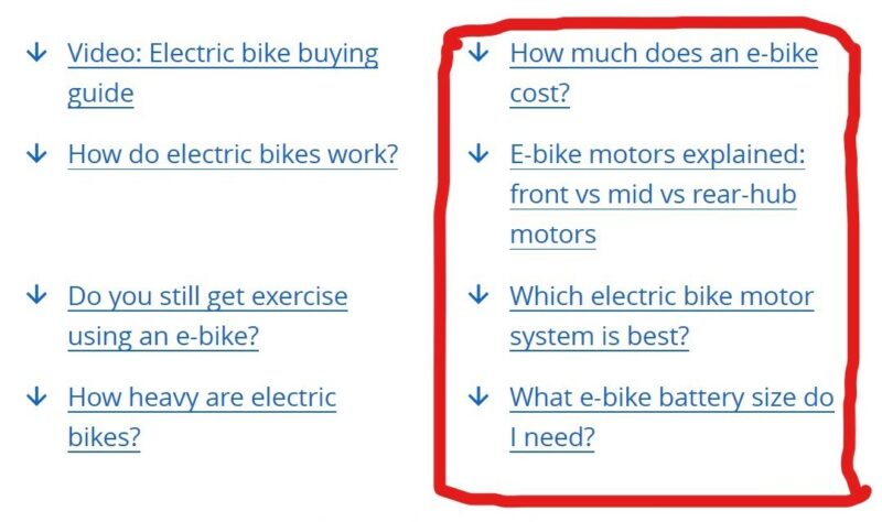 Well there is nothing that I can find against the use of e-bike ( except, perhaps the cost!). My problem is in deciding what the ideal bike is for me! There are so many important factors to decide upon before shelling out hard cash, that I am still in the research stage. Making the wrong choice, or choices, could be an expensive mistake! These which I have ringed in red are the most important factors to decide on – and get right!