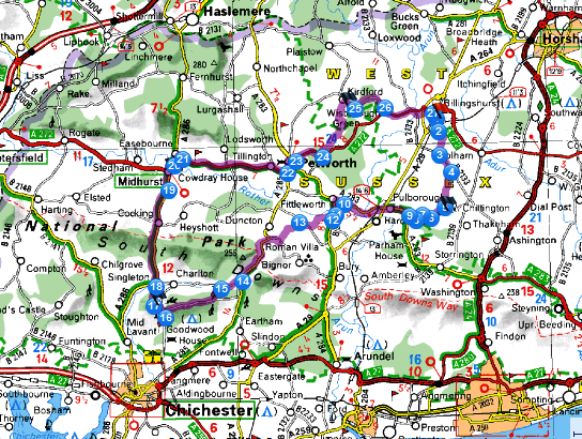 Somewhere between numbers 3 and 4 on the above map, as we were approaching West Chiltington, we came across signs marking the route of a Wiggle Sportive. For much of our ride for the rest of the day, our Michelin route followed an identical one to that of the Sportive. The route turned out to indeed be a very scenic route. Top marks for Michelin!