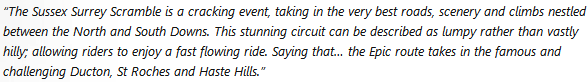 A short diversion. Two years ago Tom and I cycled down to Midhurst (by a different route). Stopping at a village shop for some bottled water, Gina suddenly appeared from a turning opposite! On that occasion she was riding in a sportive, and probably the same one that we were now mirroring. There were two options for this Wiggle ride, the Epic at 91 miles and the Standard at 60 miles, which were to be ridden on the following day, Sunday 10 June. These rides start/finish at Pulborough, which is between nos. 9 and 10 on the map above.
