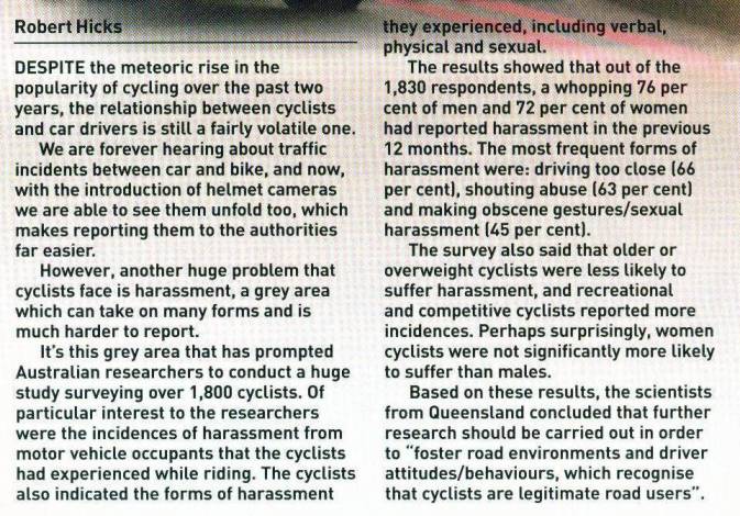An article in Cycling Weekly, the week before last, concerned recent research into the harassment of cyclists by motorists. Although the research was carried out in Australia, the findings apply equally in the U.K. The problem is likely to be much worse for commuters, for example in the London rat race. This subject is important as we have all suffered various degrees of harassment, and for this reason the Editor’s write up to the article also appears on the Cycling Weekly’s web site at http://www.cyclingweekly.co.uk/news/blog/530868/abuse-from-drivers.html (As do many other interesting cycling articles).