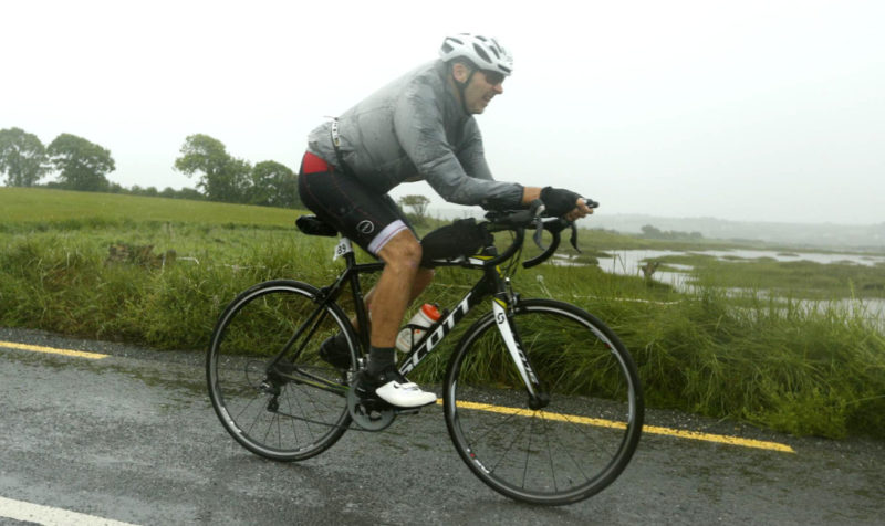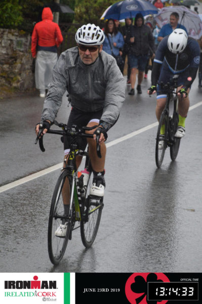 For the bike I wore a craft vest, cycle top, thin arm warmers, a rain jacket, cycle mitts, long distance tri shorts, merino socks – I hadn’t got any rain covers for my cycle shoes. I was pretty cold waiting to start but others really looked completely under-dressed for the weather and looked freezing. On the ride the tri-bars helped an awful lot and I used them not just for speed but also because it was warmer keeping as much out of the wind and rain as possible. At 42km into the ride I noticed the distance and noted that I would have to run that distance later; it had taken me over an hour and a half to cycle that far and it was a real reminder of how much more I was hoping to do. On the first lap I felt I was doing OK on the bike; I was overtaking more than I was being overtaken, but maybe that just reflects that I started near the back. My nutrition plans weren’t completely set in my mind and I think I would have benefited if they had been. With the wet it was more difficult to get at my salt tablets as they were in the cycle jersey under the rain jacket so I didn’t take them at the regular intervals I had intended. At 70km Alastair Brownlee went past with a motorcycle behind him (his 160km) – he was the first pro I had seen but after the event I saw that he was third on the bike leg beaten by about quarter of an hour, so two others must have already gone past by then. Although the route was hilly the main climbs had been long drags at up to 5% but at 87km in the town of Youghal there was a 400m 20% climb of Windmill Hill (I had missed this out on my training ride as it was after a no entry sign but I had walked it on the Saturday after hearing about it at the briefing) – lots of support on the hill and I was glad to see Sue cheering me on. I had told Sue that I would be there between 11.00 and 11.30, but due to the late start I wasn’t there until almost 12.30. Then onto the second lap of the bike and more of the same – I think the rain got worse and the wind possibly stronger or colder but perhaps I imagined that. I was ticking off each 10km marker counting down to the ride finish. The Irish support for the event on the roads was fantastic, especially given the weather. Windmill hill the second time I was getting great encouragement cycling up when most were walking. I had tried to keep HR below 135bpm on the bike but Strava tells me I averaged 133 bpm with a max of 168bpm; I can definitely see the peaks were on Windmill hill each lap. (I may have been better walking the hill as I did feel pretty spent at the start of the run). My bike time was 7.36.31.
