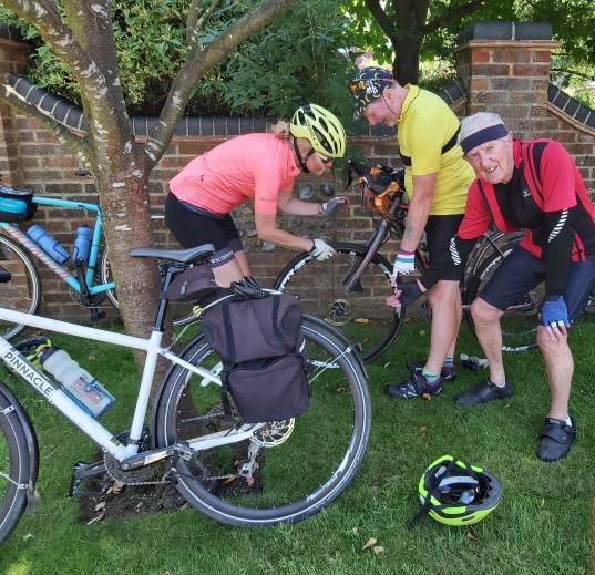 The hottest day of the year so far – the forecast was for 33 degrees and it certainly felt like it in the sunshine. Fortunately there was an intermittent breeze which was a real blessing with every gust, also the shade from over-hanging trees along parts of the country lanes. Our destination was the Aircraft Museum at Shoreham which I had not visited since 2019. We got as far as Halsted when “Puncture!” was called. Our damsel in distress was Julie. Not a usual cause of deflation, but a drawing pin – not something you expect on country lanes!