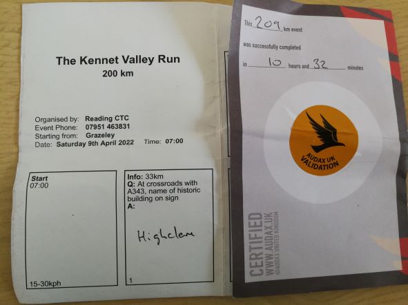 Here, at the “control” we had to find the phone number of Adam and Eve, which we discovered was the village hair dresser’s. We stopped on a bench for a few minutes to fill in all the answers on our Brevet card and have an energy bar. Soon we were joined by the fixed wheeler and the other chap. The fixed wheeler headed off a few minutes ahead of us but we soon passed him as he was walking up a fairly brutal (but short) hill. It was then largely downhill over the last 20km back to the village hall for well-earned tea, a bite to eat, and the registration of our Brevet card.
