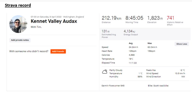 Officially the ride was 207km, and we finished at around 5.30pm. We cycled back to the car, heading the wrong way from the hall at first so the full distance ridden was 212km at a respectable 24.2kph average. This was my longest ever ride and I was surprised that my feet were not in pain at all; a notable improvement on other longer rides I have done so perhaps double socking works. The weather had been pretty kind and I had been able to manage the temperature changes quite well.