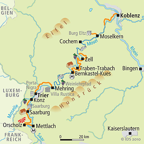 The internet is a valuable resource with lots of useful websites on cycling in the Rhine/Mosel areas. This one has a useful,navigable Google map of the the cycle route from Trier to Koblenz, with another page showing distances between towns/villages along the river. Also links to tourist information sites including B&B.