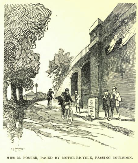 2. However the OS map does show the next one, up the old A23 before the new by-pass was built. Below it is as shown in a book about the history of the Brighton Rd. The London to Brighton road was a must challenge for racing cyclists – hence this drawing of the first lady to set a record, passing the milestone at Coulsdon in about the 1890s.