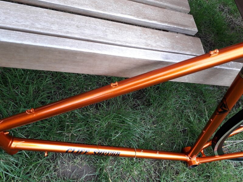 “Metallic Orange”, I said so we went upstairs to see Winston’s brother Mario who does the spraying. Mario knew Cliff back in the day and was really pleased I was calling the frame a Cliff Shrubb. I was looking around at the colours and found a colour very similar to the orange McLaren use for their super cars, it had to be the one. Winston said the work would take a month and gave me a rough price.