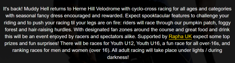 Something completely different for spectators or those who want a bit of competitive fun, click on the link to the web site below for more details and a couple of videos https://www.hernehillvelodrome.com/raphamuddyhell