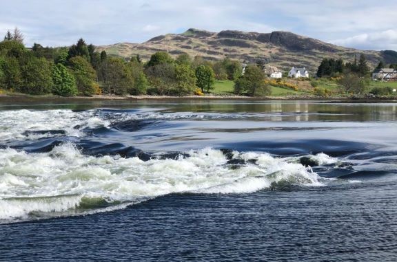 The loch is also famous for the Falls of Lora. These form at the mouth of Loch Etive when a particularly high tide occurs, 2 to 5 days either side of a Spring Tide.