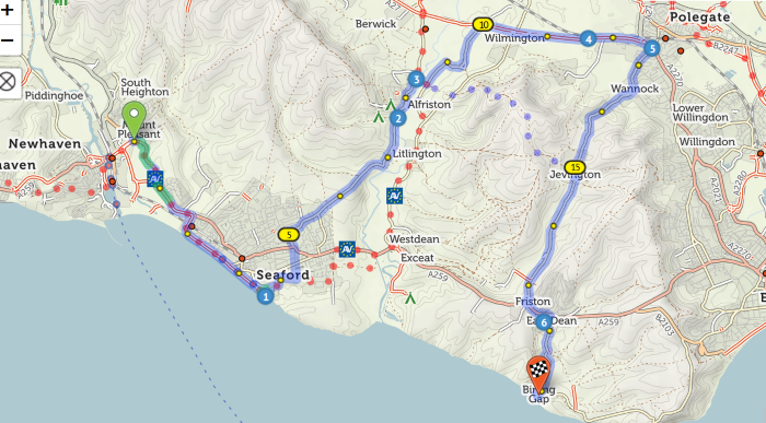 This was our day’s route via Seaford, Alfriston, and Polegate, back to the coast at Birling Gap