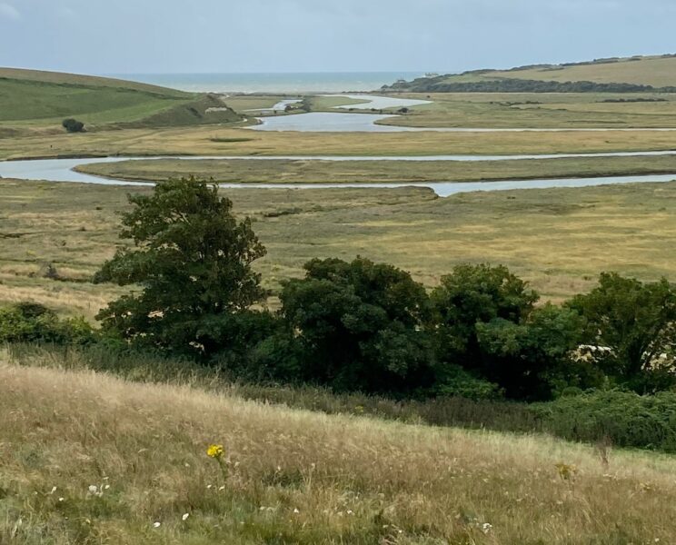 NCR 2 continued along the coast but we turned off, heading out through the town centre to take the road which climbed up to Alfriston. This South Downs climb is described thus “Not well known, the High and Over viewpoint is an absolute delight to those who come across it.” From this high point there is a 360 degree view over the best of the Sussex countryside, and looking back towards the coast, the most famous view in the distance – Cuckmere Haven.