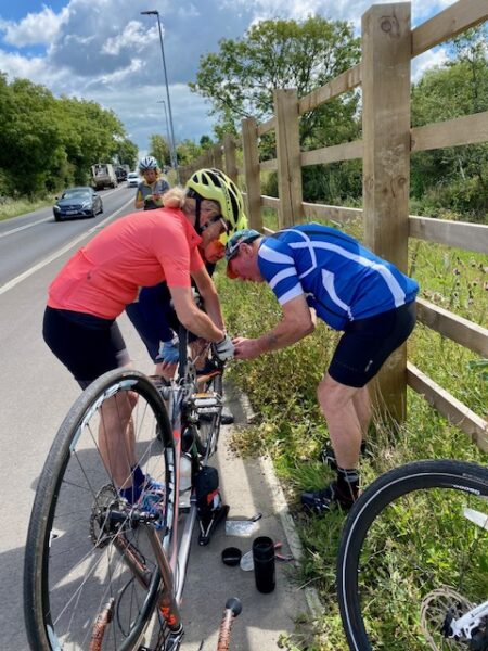 Our second mechanical issue was a few miles after Alfriston, when Julie had gear change problems. This resulted in her having to get off and push the bike to the top of a steep incline. It was found to be due to a broken rear derailleur cable. This results in the chain being stuck on the smallest rear cassette cog = highest gear. The bike was rideable, but a real problem when climbing hills!