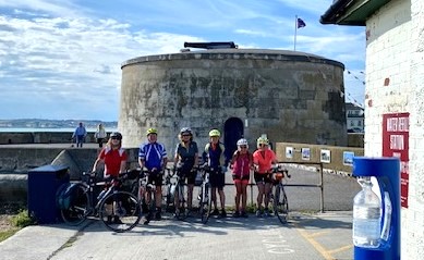 We had a brief rest at the top of the Friston Hill climb to get our breath back, and to let the traffic caused by our snail pace, to go by. Then it was our turn to feel the wind in our hair on the long and fast descent on the A259 to Exceat and the bridge over Cuckmere River. Here we again joined NCR 2 and followed it’s off-road section which took us into the western end of Seaford. Here, back at the time of the Napoleonic wars, a Martello Tower was built to protect England from an invasion by the French. Note the cannon still on it’s roof to repel any invaders!