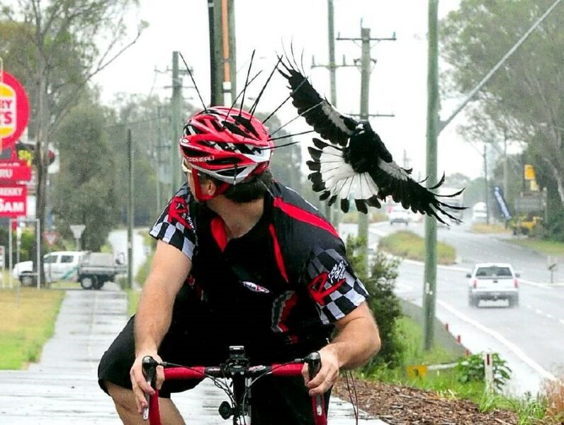 I soon discovered that you cannot out cycle them. They can match your speed with ease. As instructed, I carried a small pump in my back pocket which I waved around my head furiously as a deterrent. Although the magpies can cause minor injuries, the main danger I found was that the attacks completely took my mind off the road. Wobbling around with one hand on the handle bars, trying to look back and upwards whilst still considering traffic, pedestrians and road furniture was all but impossible. This is the problem! [Magpie Attacks Cyclist in Australia 😱😱😱 – Bing video].