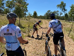 After a short while we dropped down through vegetation towards the river when Martin stopped, closely examining his front tyre. Each of us started to inspect our tyres to discover 20 or so thorns in each! The thorns are called bullhead thorns and have five very sharp spikes which point in different directions. Whichever way they land on the ground there is one spike pointing directly up – a clever design but a cyclist’s nightmare. We all suffered multiple punctures to the extent that we exhausted our supply of inner tubes and even the tubeless was struggling to reseal so many holes. So, after less than an hour’s cycling we sadly admitted defeat and abandoned the ride. Four hours of driving for 7 miles of cycling. What a disappointment!