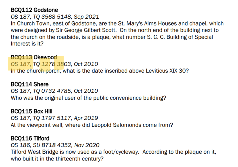 1278 3803 is the relevant 8 figure map’s Grid Reference number for the location in Okewood. The highlighted 12 38 are the identifying numbers of the 1km x 1km Grid Square on the map. The additional numbers 78 and 03 allow one to estimate with great accuracy, the specific place of the Quest item, within the Grid Square – i.e. in this case, the church. But you should not need these extra numbers at Okewood, because churches are already clearly marked on O.S maps!