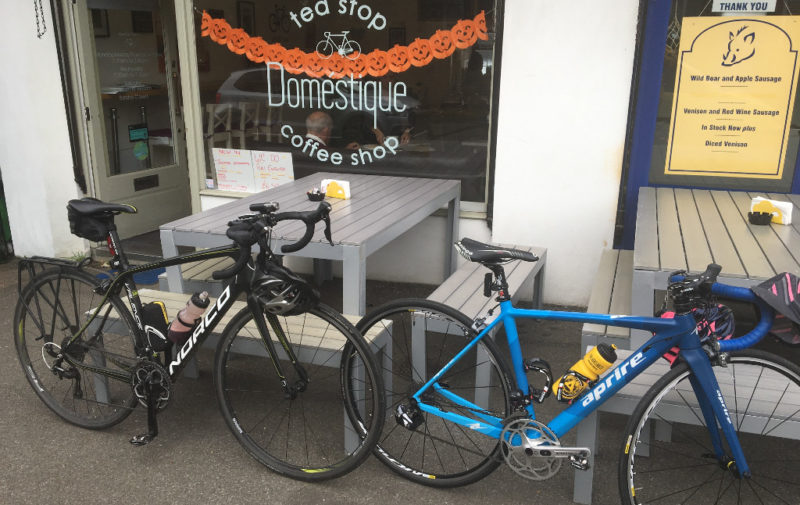Well it was just the dynamic duo of Karen and Pete that turned up at Shurguard, so after waiting the customary eight minutes for latecomers we headed out along Chipstead Valley Road, Kingswood, Epsom Downs and up to Domestique Cafe at Bookham. We pushed the pace and arrived at a respectable 14.5mph average.