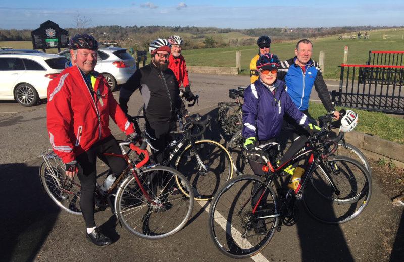 The ride pace was deliberately easy as some of us were recovering from flu and mince pie overdose. The first climb was Farthing down, after which we regrouped at the car park for a sunny team photo.